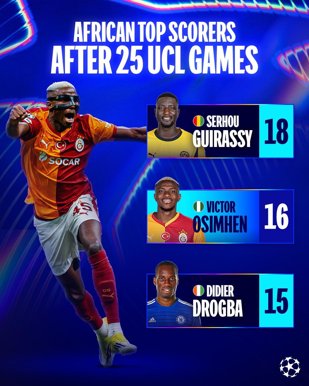 欧冠官方数据统计,非洲球员在个人欧冠前25场比赛后的进球数排行如下: