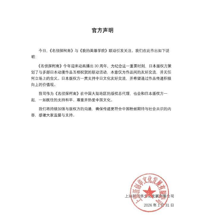 1月31日晚,《名侦探柯南》中国大陆地区版权总代理上海新创华文化发展有限公司发布声明,称联动仅为“作品友好交流”“无立场含义”,并表示将加强与日方沟通。但这份声明未能平息舆论质疑,反而暴露出部分海外IP对中国民族情感与历史记忆的漠视,也再次警示文化交流必须坚守底线。
